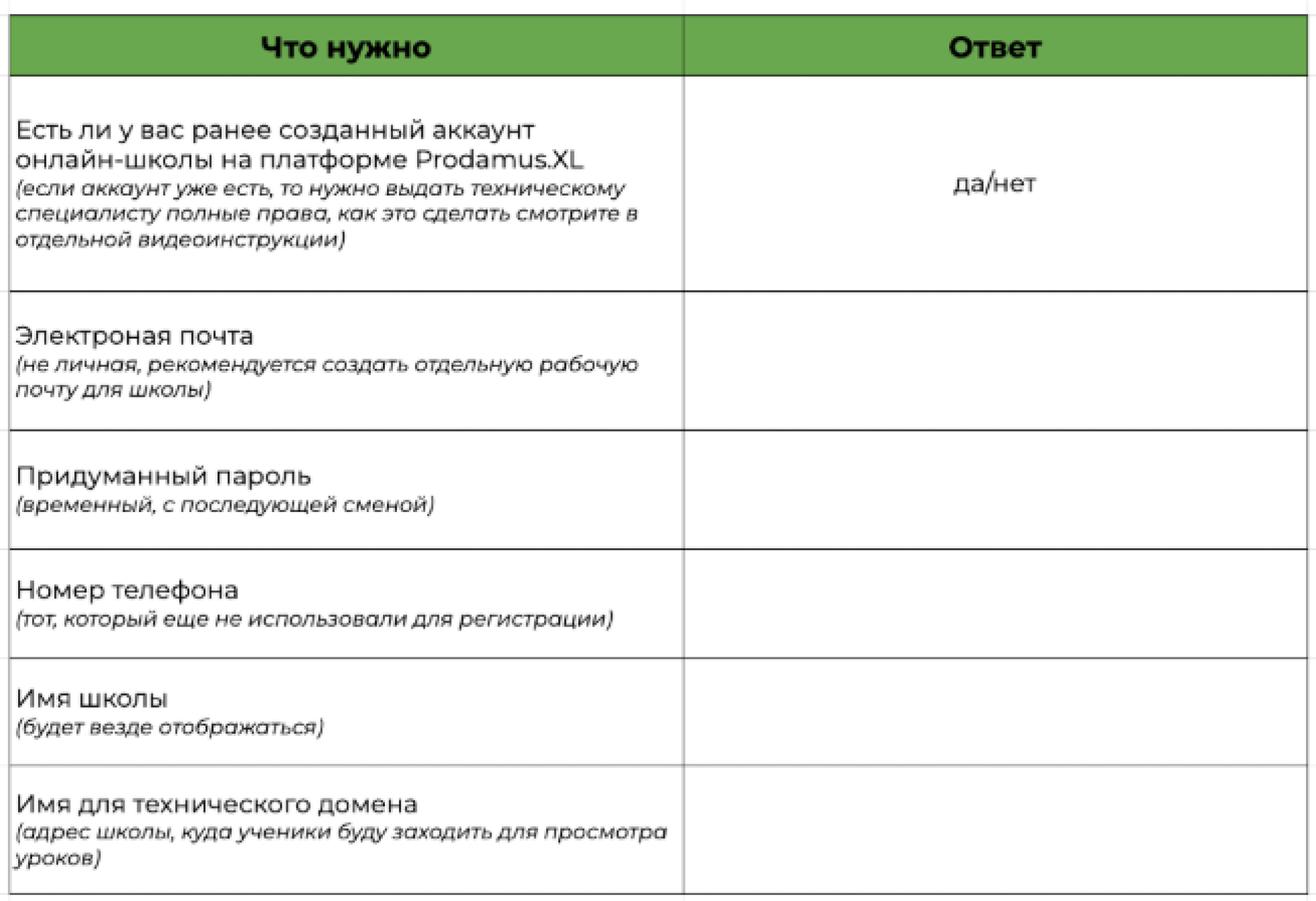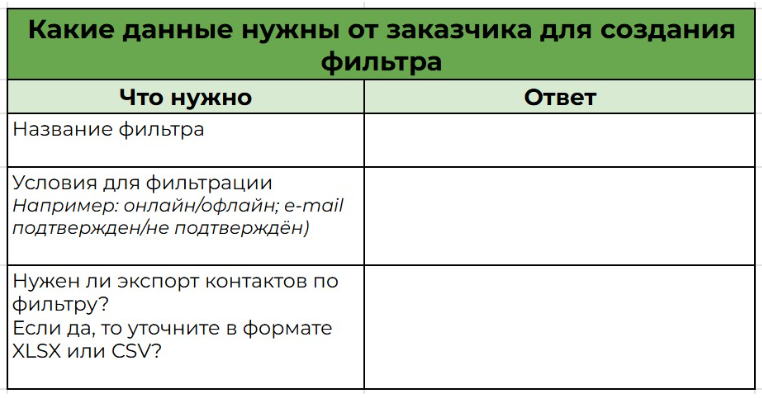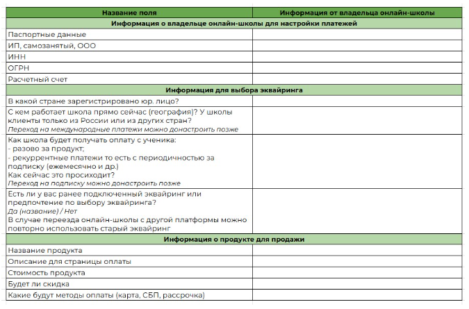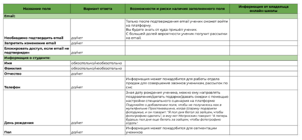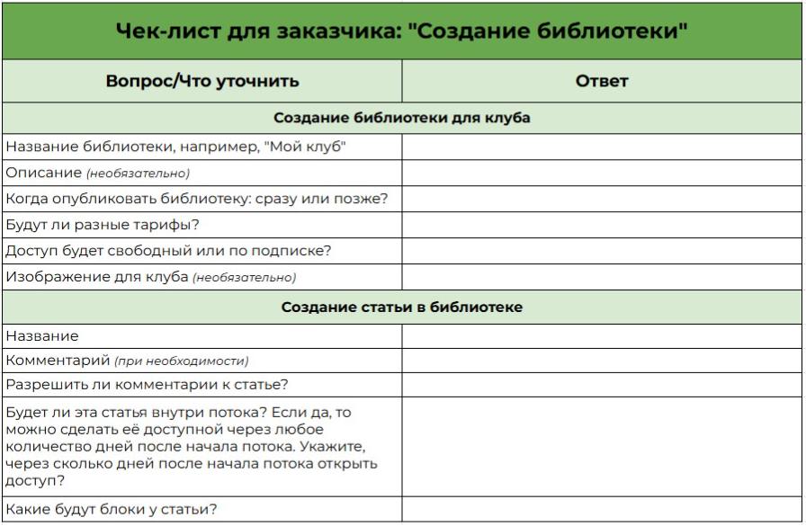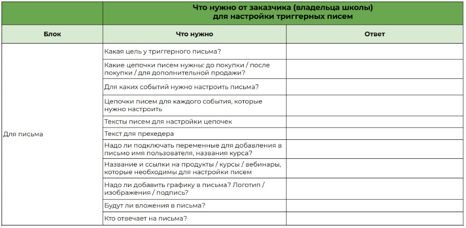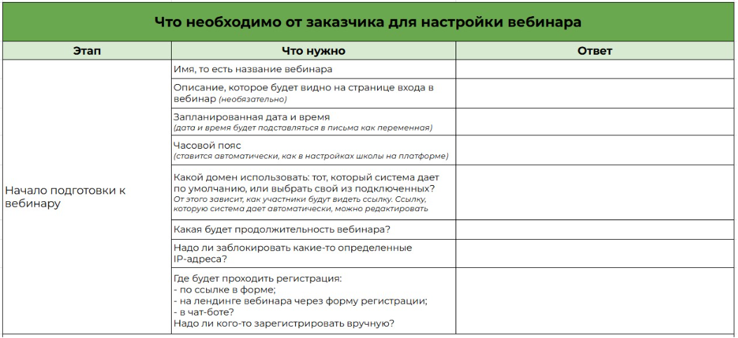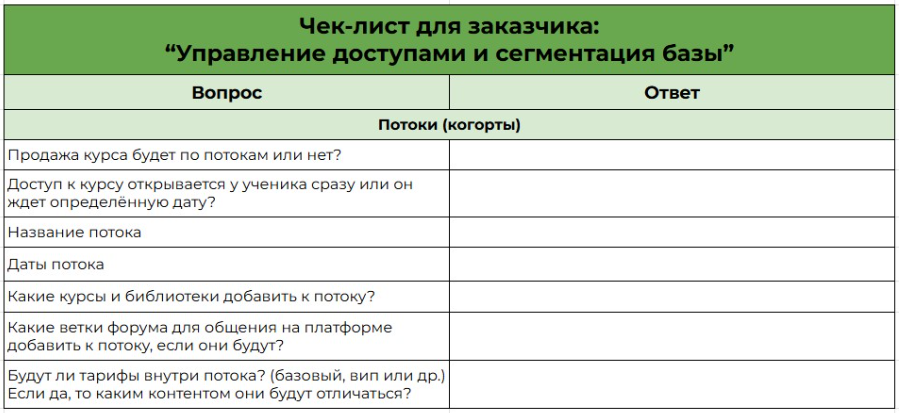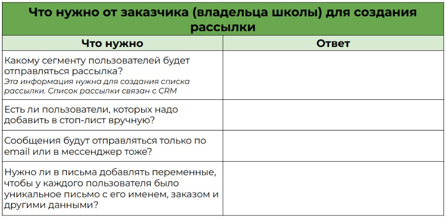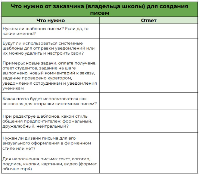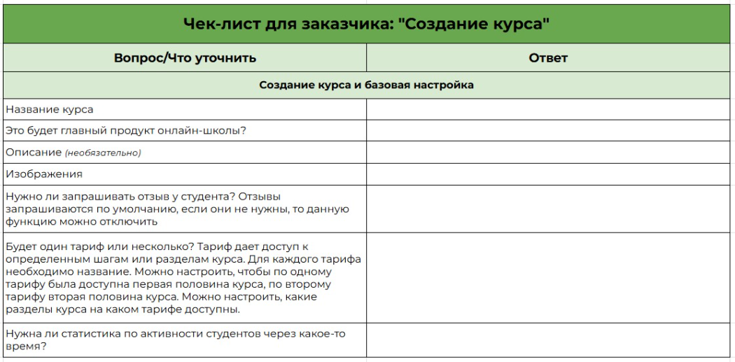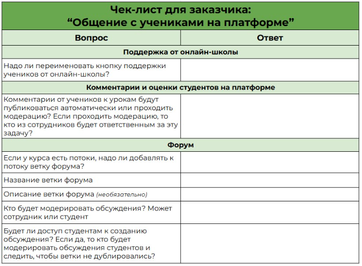Используйте чек-лист “Общение с учениками на платформе” — отправьте заказчику таблицу, куда он внесёт все данные. Как он выглядит — смотрите на рисунке 2.