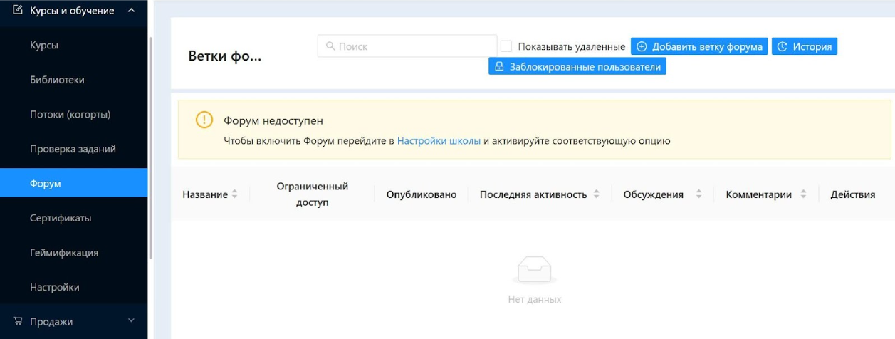 Форум — это создание темы для обсуждения на платформе. Все пользователи, которые имеют доступ к этой ветке форума, могут что-то писать. Перед началом обсуждения в ветку форума надо добавлять какой-то контент. Удобно использовать, чтобы найти переписку и не потерять сообщения на определённую тему. Форум может мотивировать ученика зайти на платформу.