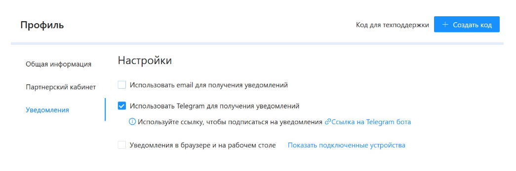 В профиле на платформе есть своя галочка на отправку уведомлений в Telegram через чат-бота — смотрите на рисунке 4.