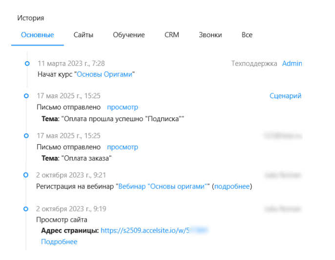 В карточке видны все его действия: когда зарегистрировался, что оплатил, какие уроки прошёл, выполнил ли задание, какие письма открыл и др.